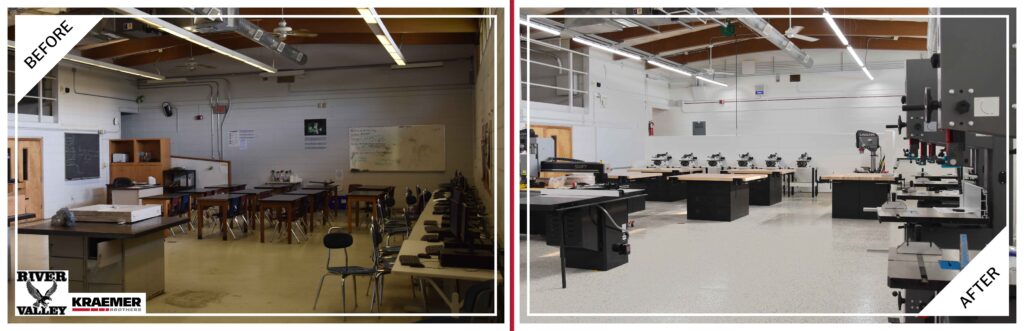 As part of River Valley’s initiative to promote skilled trades, the district chose to renovate the high school’s wood shop. Over the summer, new epoxy flooring was installed, windows were replaced, electrical systems upgraded, and the restrooms completely renovated. An ADA-compliant ramp and new overhead doors now significantly improve accessibility to the shop.