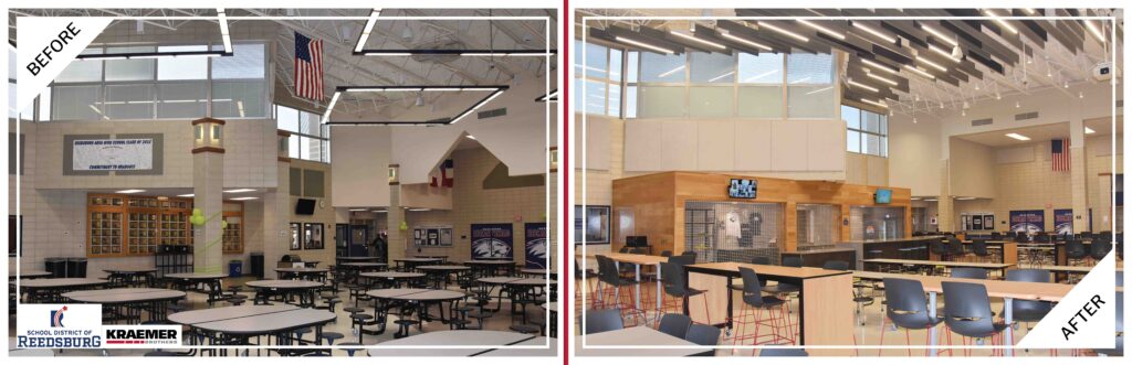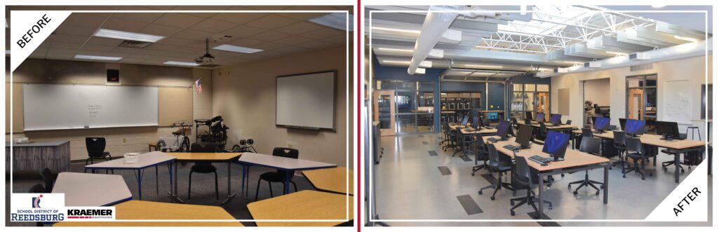 The School District of Reedsburg’s commitment to innovative learning began with Phase I of their referendum. Designed by EUA, the high school library was transformed into a state-of-the-art fabrication, collaboration, and design/innovation lab. This new space supports both individual learning and large group instruction. The cafeteria was also remodeled to include a school store, updated wallcoverings, ceiling baffles, and new furnishings. Future phases will include upgrades to the technical and agricultural education departments.